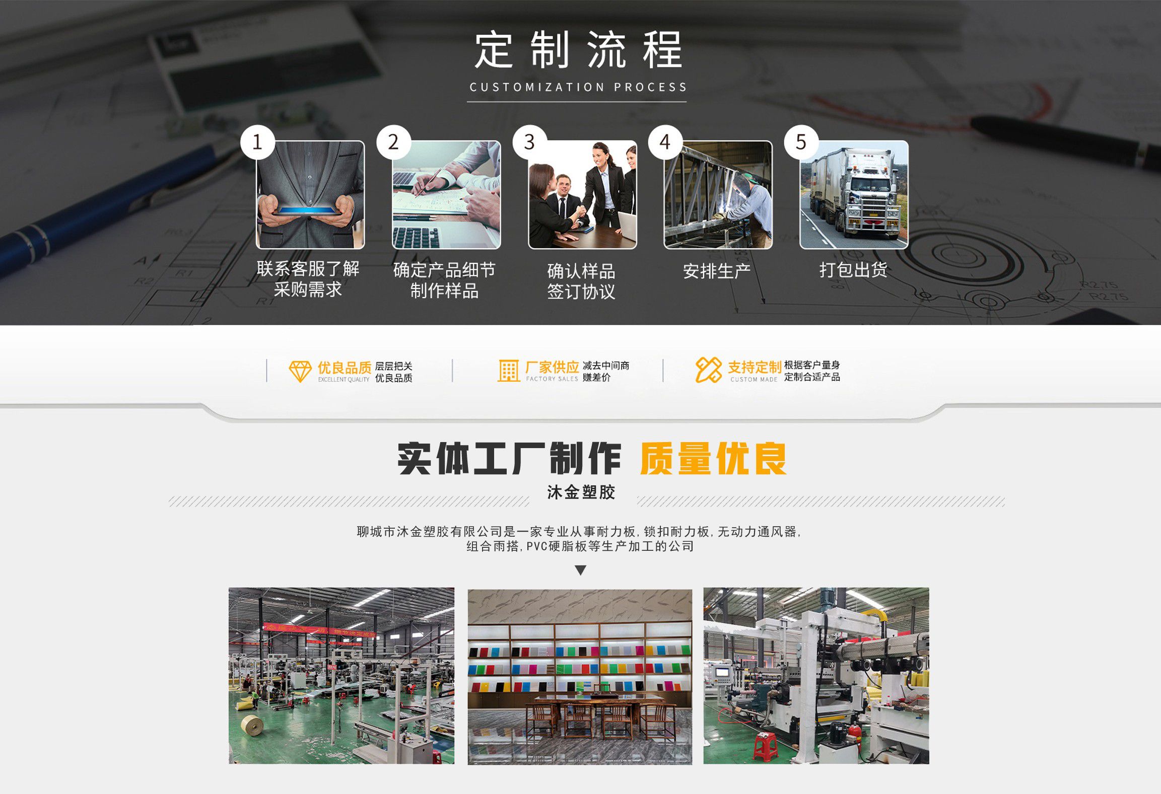 聊城市沐金塑膠有限公司注冊資金2180萬元,占地20000余平方,擁有自建廠房15000平方,員工100余名。10余年來,公司主營耐力板,鎖扣耐力板,耐力板深加工,無動力通風器,組合雨搭,PVC硬脂板,耐力板廠家等板材的發(fā)展戰(zhàn)略,逐漸成長為綜合性企業(yè)。  公司擁有多條板材共擠生產(chǎn)線,采用世界知名品牌進口原材料和先進工藝,依據(jù)完善的ISO9001質(zhì)量管理體系和ISO14001環(huán)境管理體系,為產(chǎn)品的卓越品質(zhì)提供了強有力的保證。憑借過硬的創(chuàng)新能力和堅實的硬件基礎(chǔ),贏創(chuàng)已成為國內(nèi)領(lǐng)先的熱塑性板材生產(chǎn)商,產(chǎn)品被廣泛應(yīng)用于建筑業(yè)、農(nóng)業(yè)、工業(yè)、廣告業(yè)、安防行業(yè)及DIY領(lǐng)域。  公司始終致力于通過提供最優(yōu)的板材應(yīng)用解決方案,為客戶創(chuàng)造最高的價值;堅守創(chuàng)新、質(zhì)量、靈活、服務(wù)和速度的核心價值觀;堅持“完美的產(chǎn)品需要完美服務(wù)的支持”的經(jīng)營理念,努力實現(xiàn)成為世界領(lǐng)先的板材與解決方案供應(yīng)商的夢想。  在未來,公司將立足客戶需求,不斷改變和完善現(xiàn)有產(chǎn)品,拓展產(chǎn)品線和充分開發(fā)板材的應(yīng)用領(lǐng)域,為客戶創(chuàng)造全方位的價值。同時更好地實現(xiàn)員工的價值,實現(xiàn)公司團隊的價值。我們將與您一起創(chuàng)贏未來!  企業(yè)使命:成為世界領(lǐng)先的板材與解決方案供應(yīng)商。  公司愿景:通過提供最優(yōu)的板材應(yīng)用解決方案,為客戶創(chuàng)造最高的價值。  核心價值觀:質(zhì)量...
